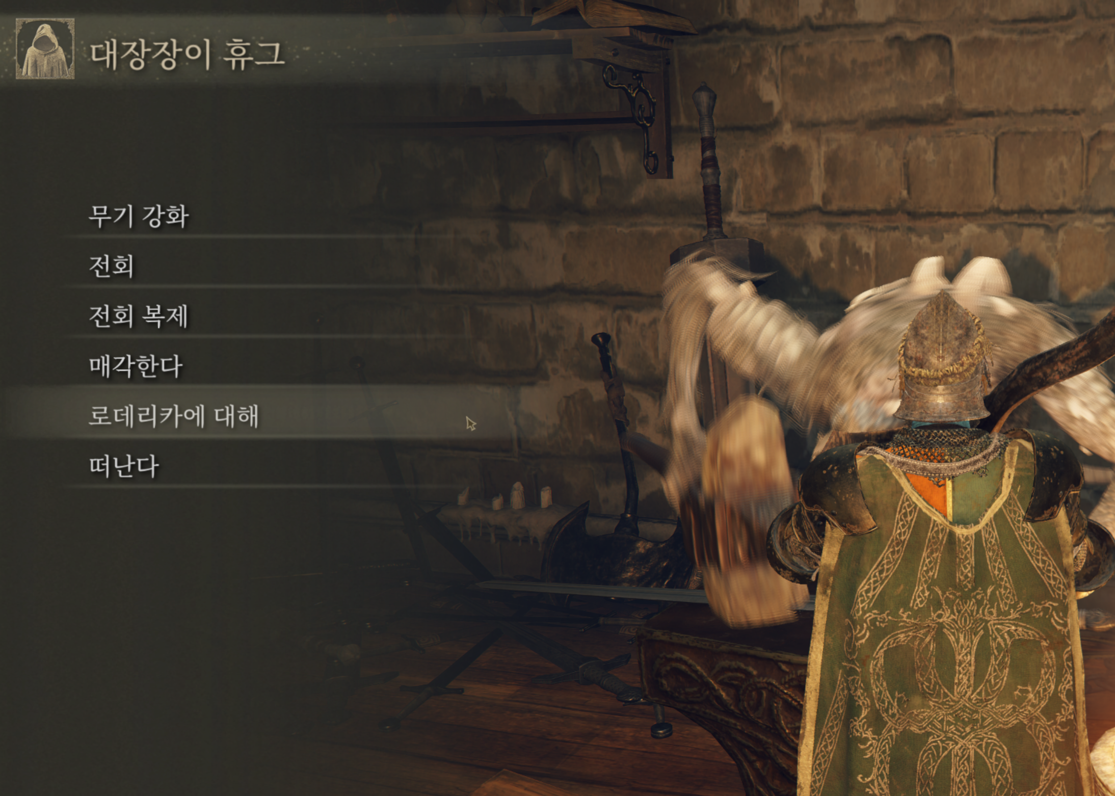 대장장이 휴그에게 가서 말을 걸면 로데리카에 대해라는 메뉴가 새로 추가되어있습니다. 로데리카에게 조령의 재능이 있다는 말을 해주는군요.