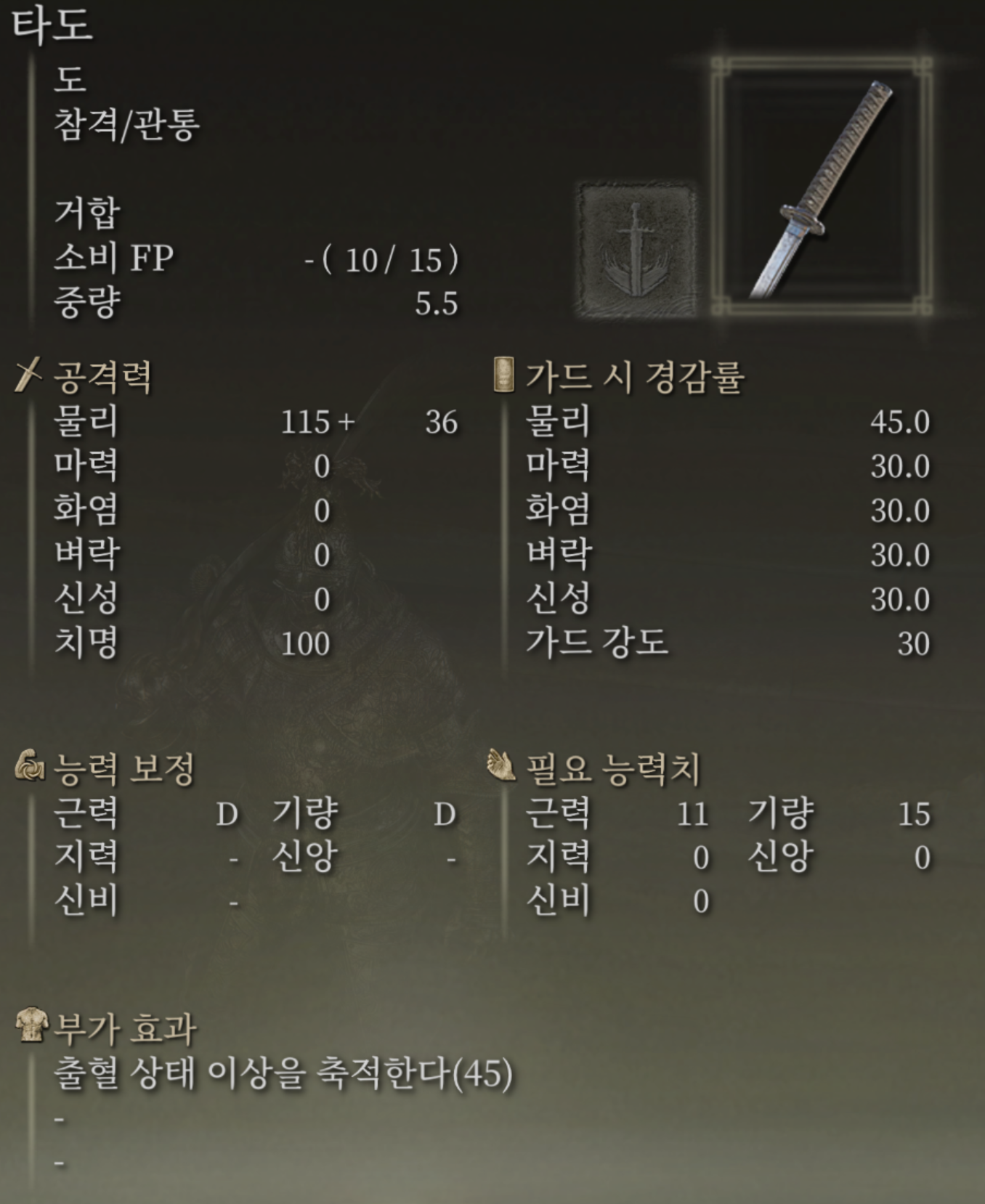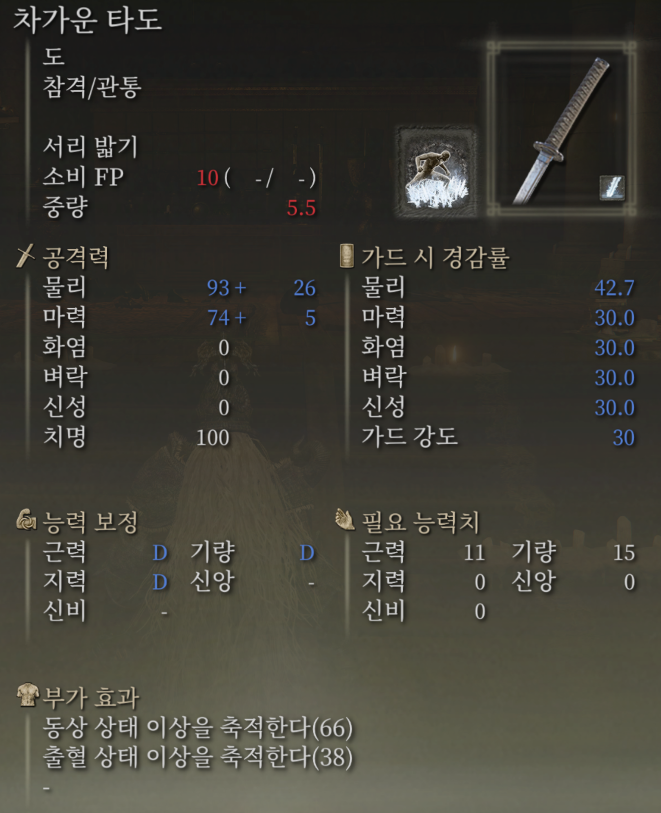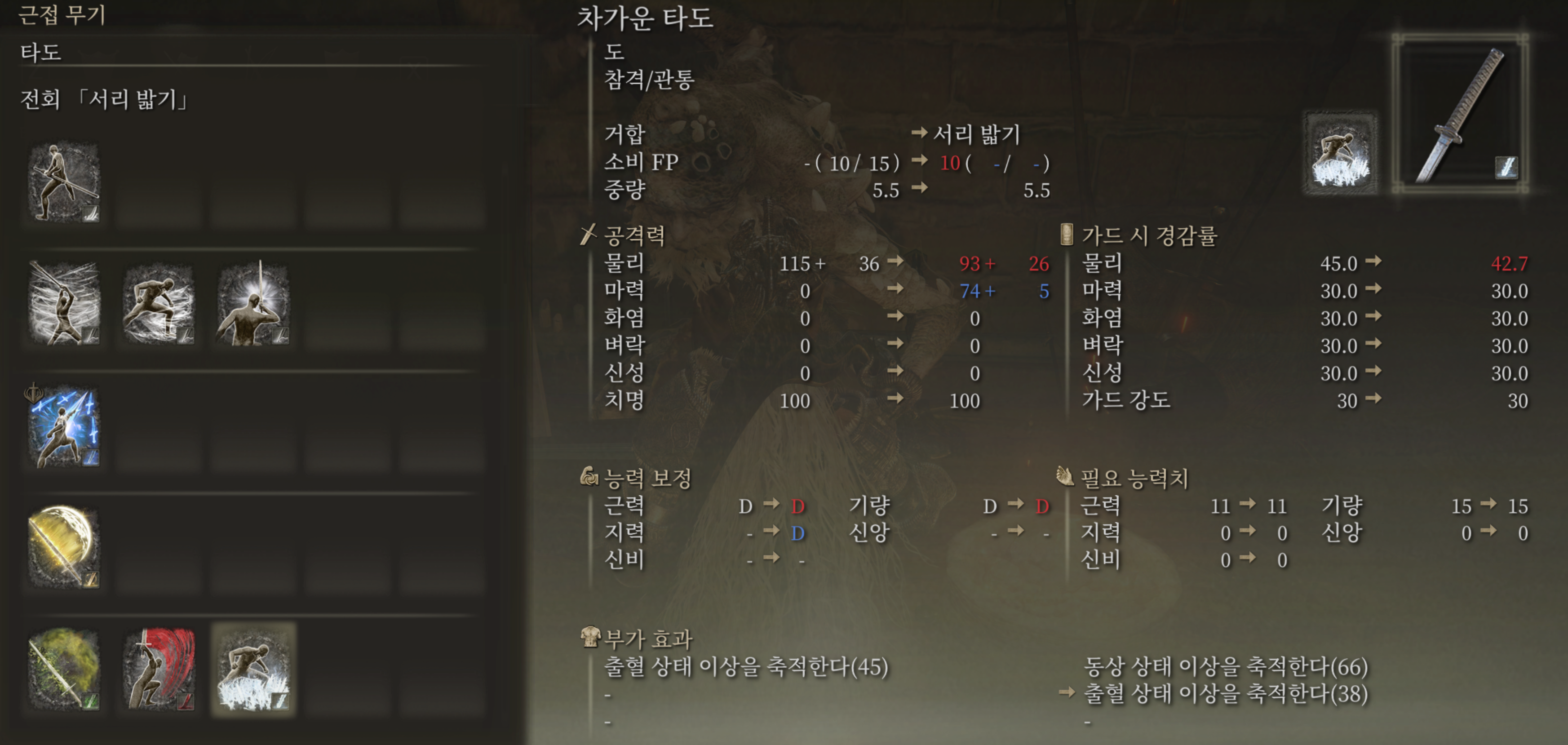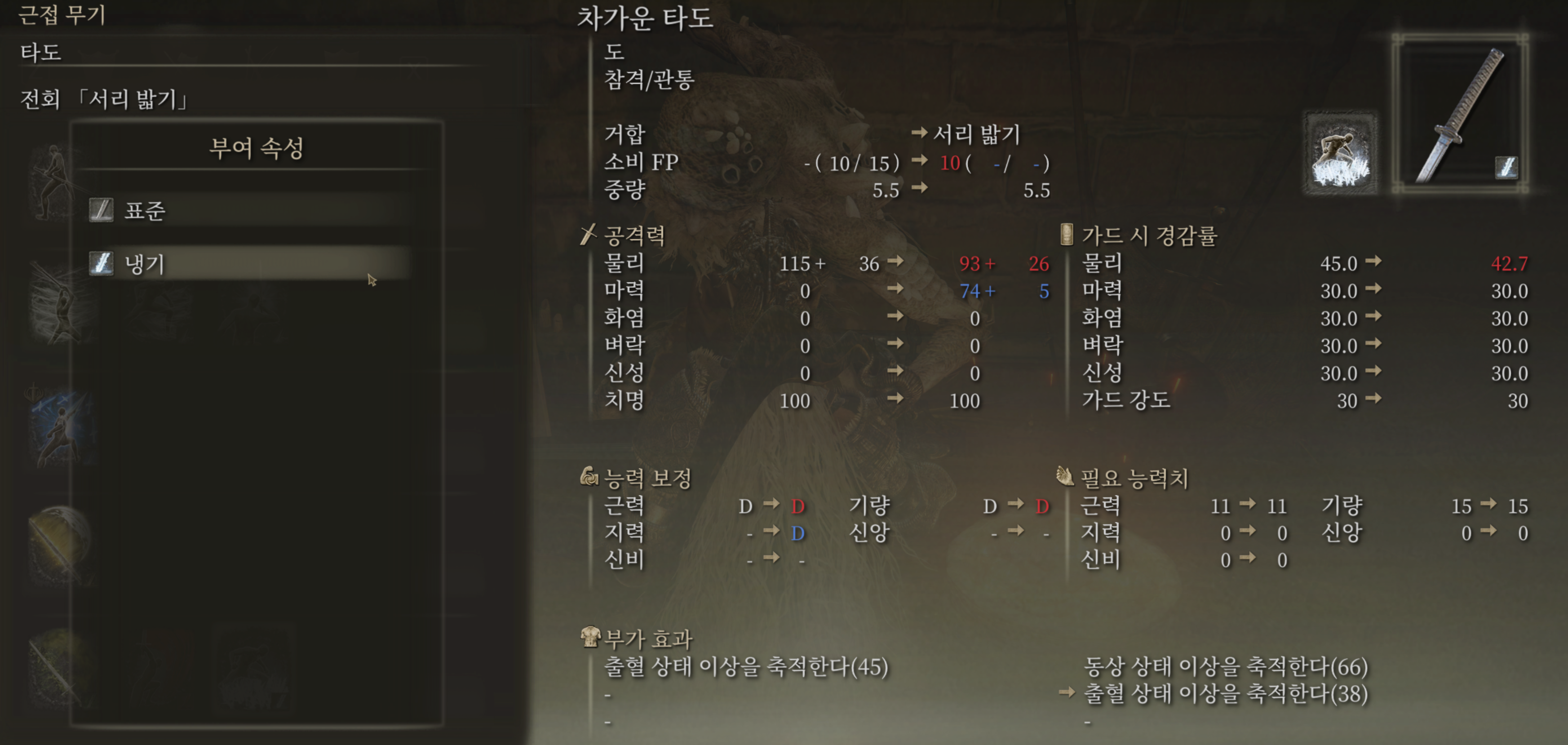 거합으로 되어있던 부분에 서리밟기가 추가되었습니다. 공격력이 물리에서 물리/마력이 되었습니다. 부가효과가 동상+출혈이 되었습니다.