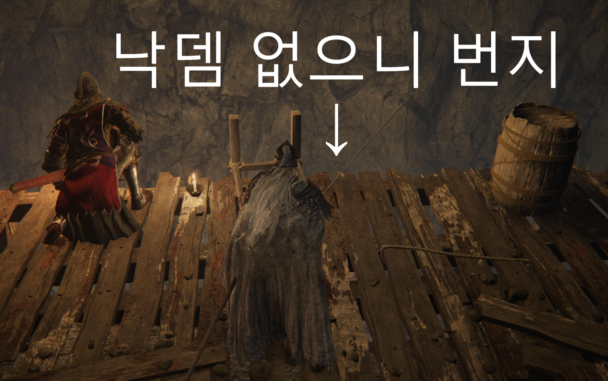안으로 쭈욱 들어가면 병사 두명이 또 있습니다. 전투는 귀찮으니까 바로 이동 해버립니다. 최대한 왼쪽 벽으로 붙어서 뛰어내려주세요!