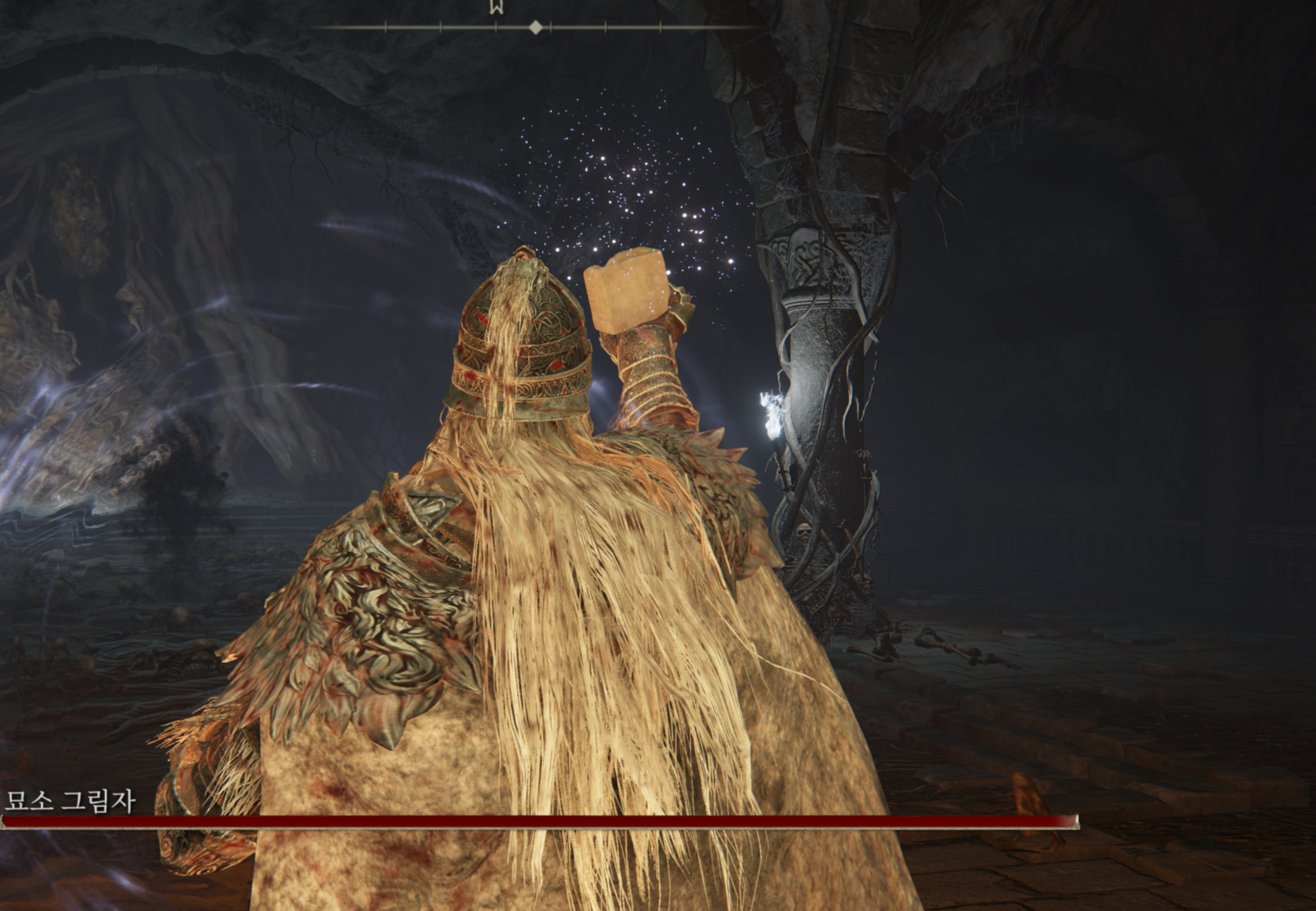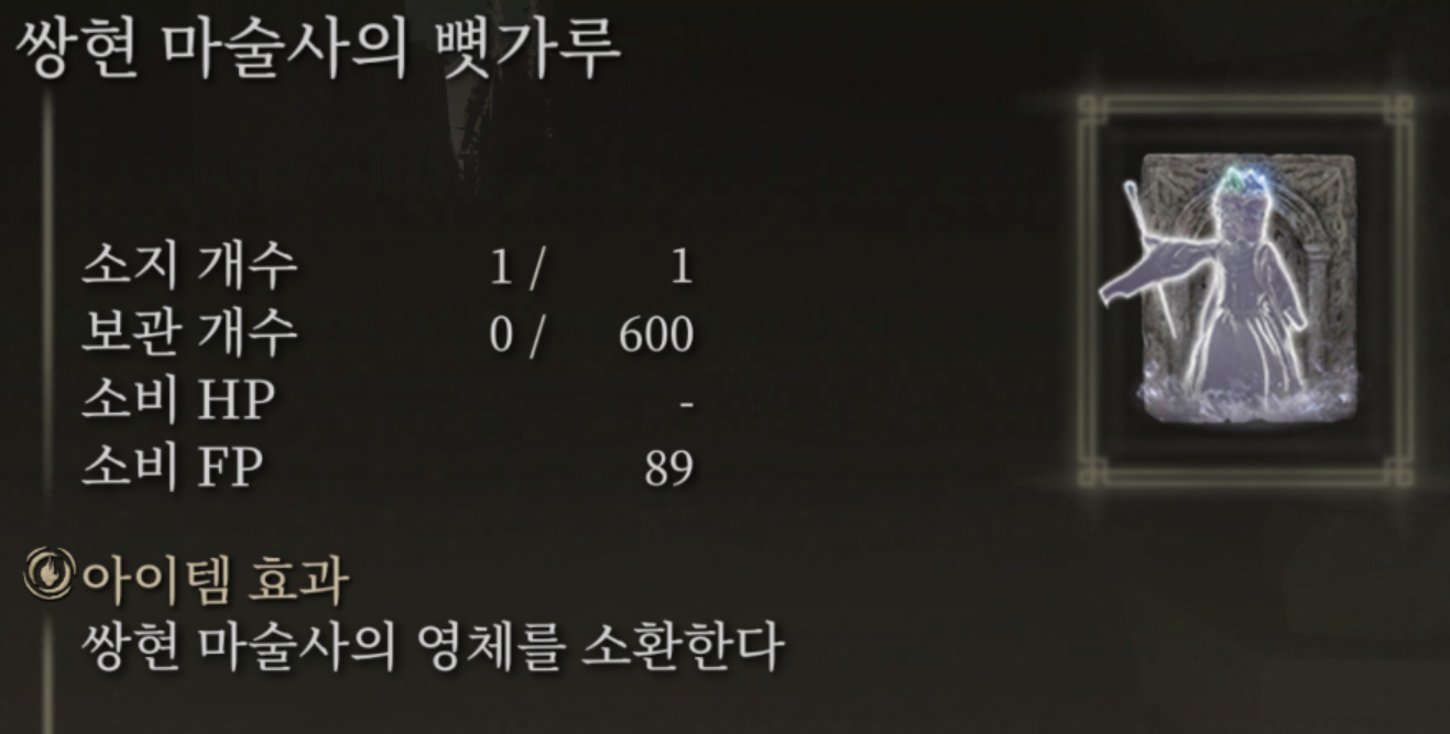 묘소 그림자와 해골이 몇마리 함께 등장합니다. 보스의 체력은 강하지 않지만 출혈을 누적시키고 해골과 함께 상대해야 하니 꽤 번거롭습니다. 영체를 불러 어그로를 분산시키면 생각보다 쉽게 잡을 수 있습니다. 묘소 그림자 처치시 쌍현 마술사의 뼛가루를 얻을 수 있습니다.