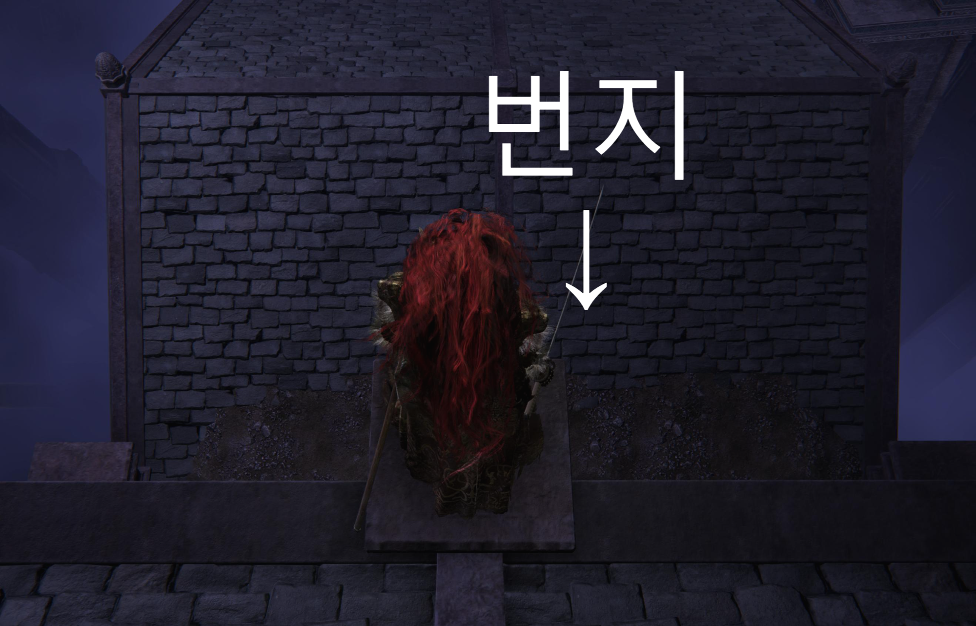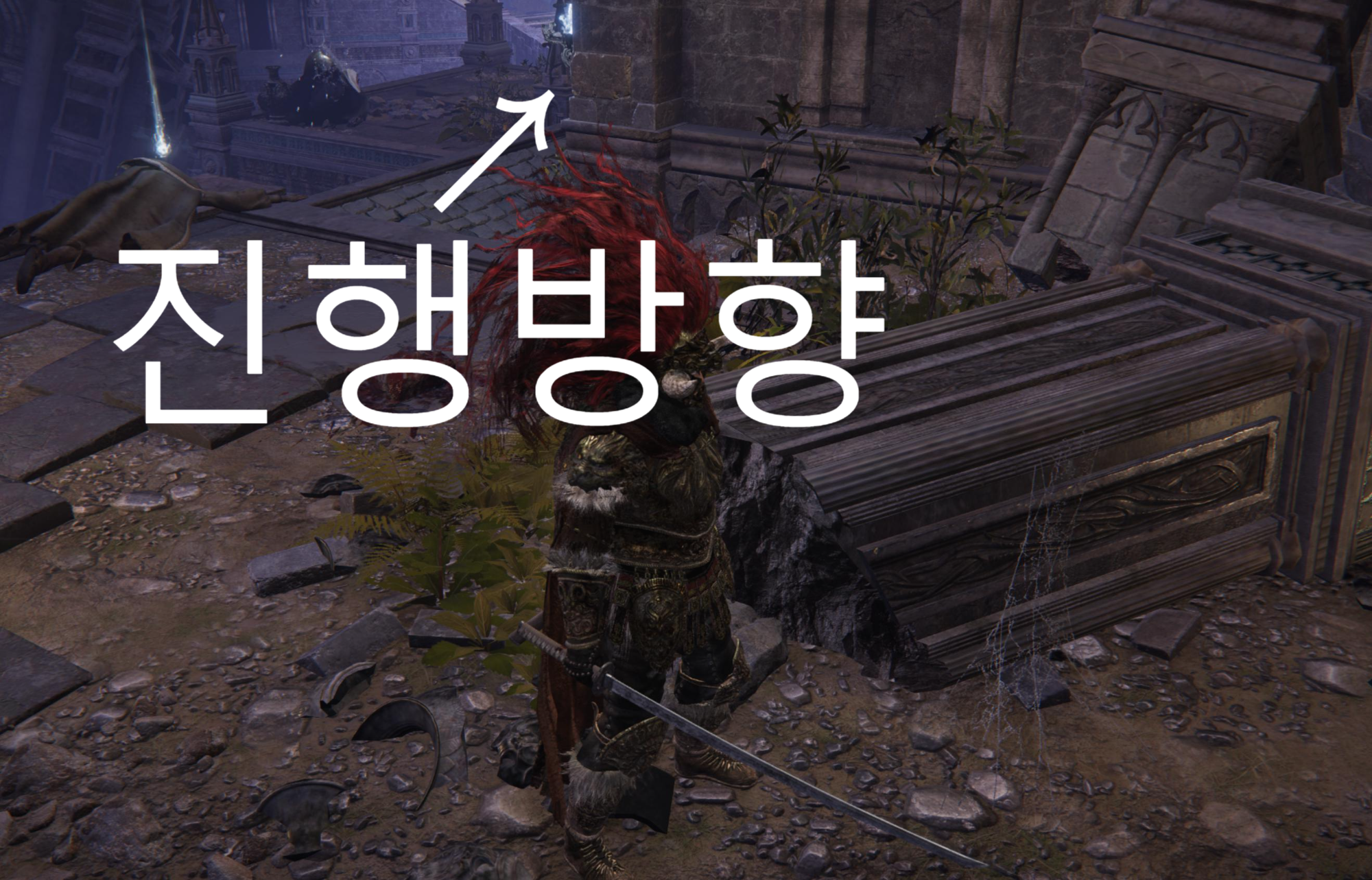 문에서 보면 왼쪽으로 무너진 길이 있는데 아래로 내려갈 수 있습니다. 내려가는길 정면에 보면 뭔가 번쩍거리는 몹이 하나 있는데 거기서 왼쪽을 보셔야 합니다.