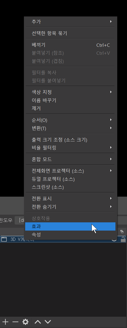 크로마키 처리를 해야하니 소스 우클릭->효과->크로마키추가 진행해서 배경색을 없애줍니다.