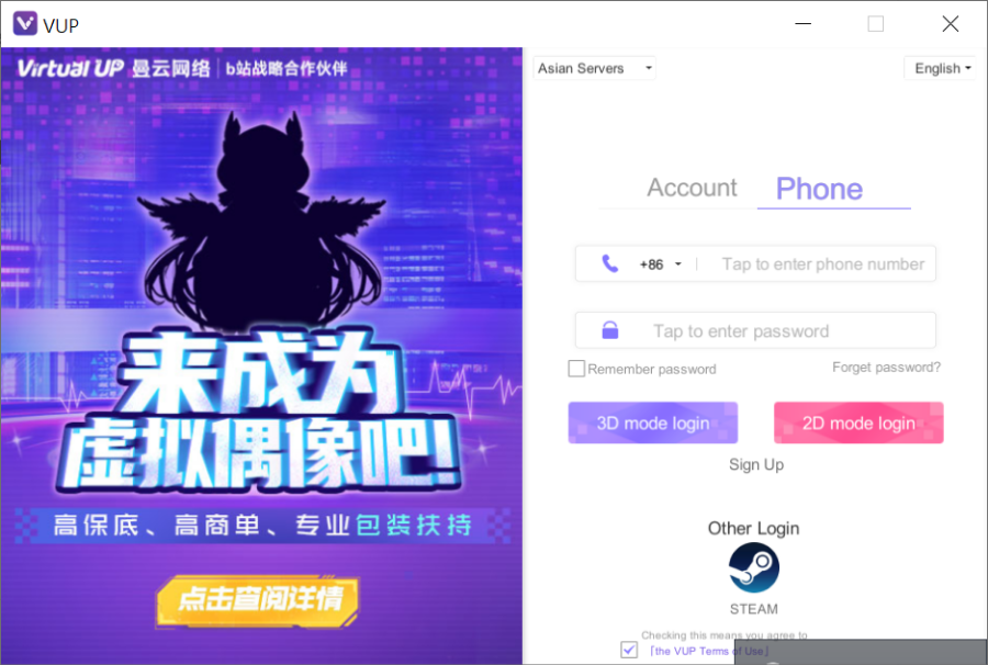 VUP을 실행하면 로그인화면이 나오는데 전 스팀아이콘을 눌러서 스팀으로 로그인 했습니다. 그리고 3D 모드로 들어가줍니다.