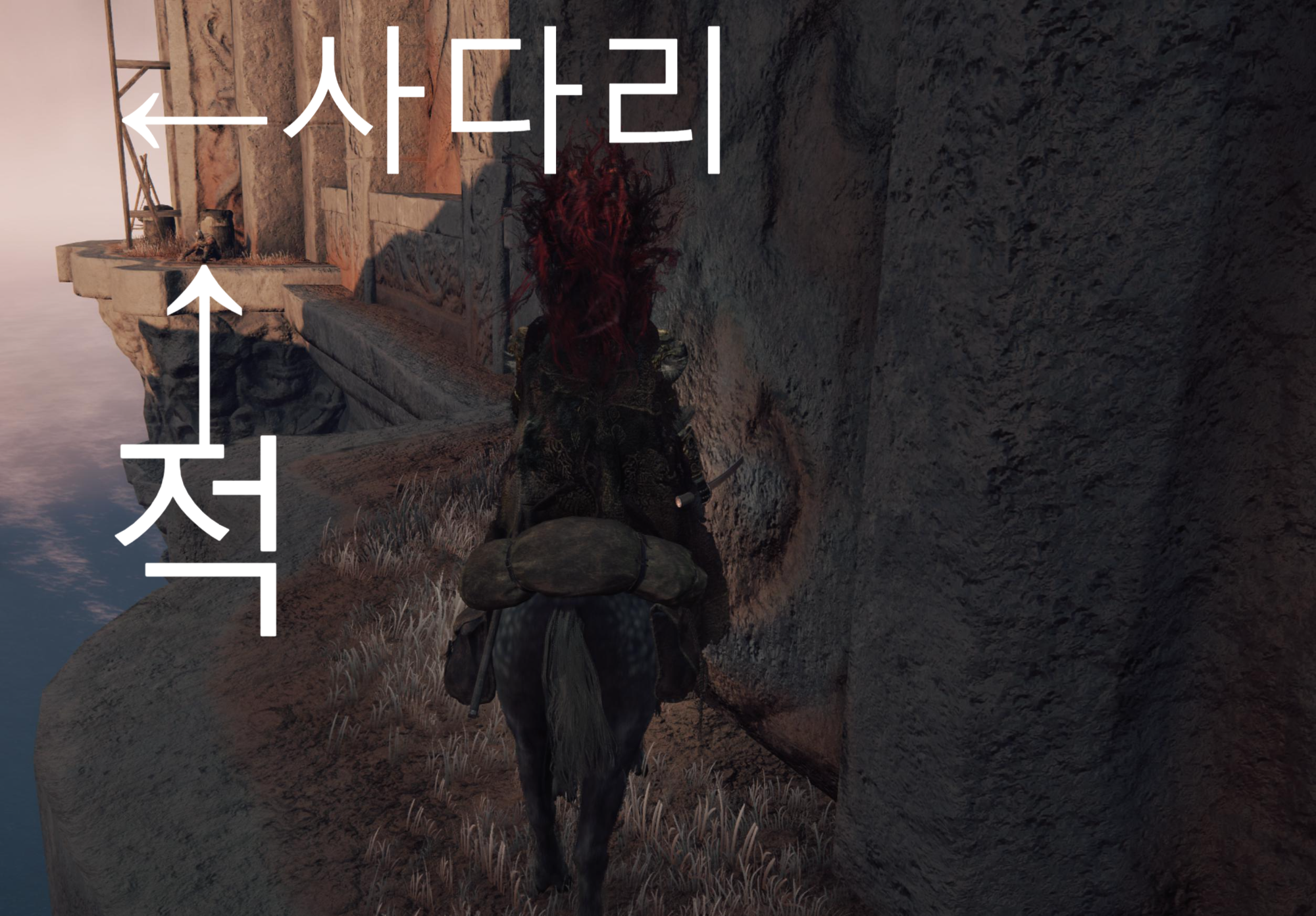 발판에 내려서 왼쪽을 보면 적이 있고 그옆에 사다리가 있습니다. 낙사 조심하시고 처치후에 사다리를 타고 올라갑니다.