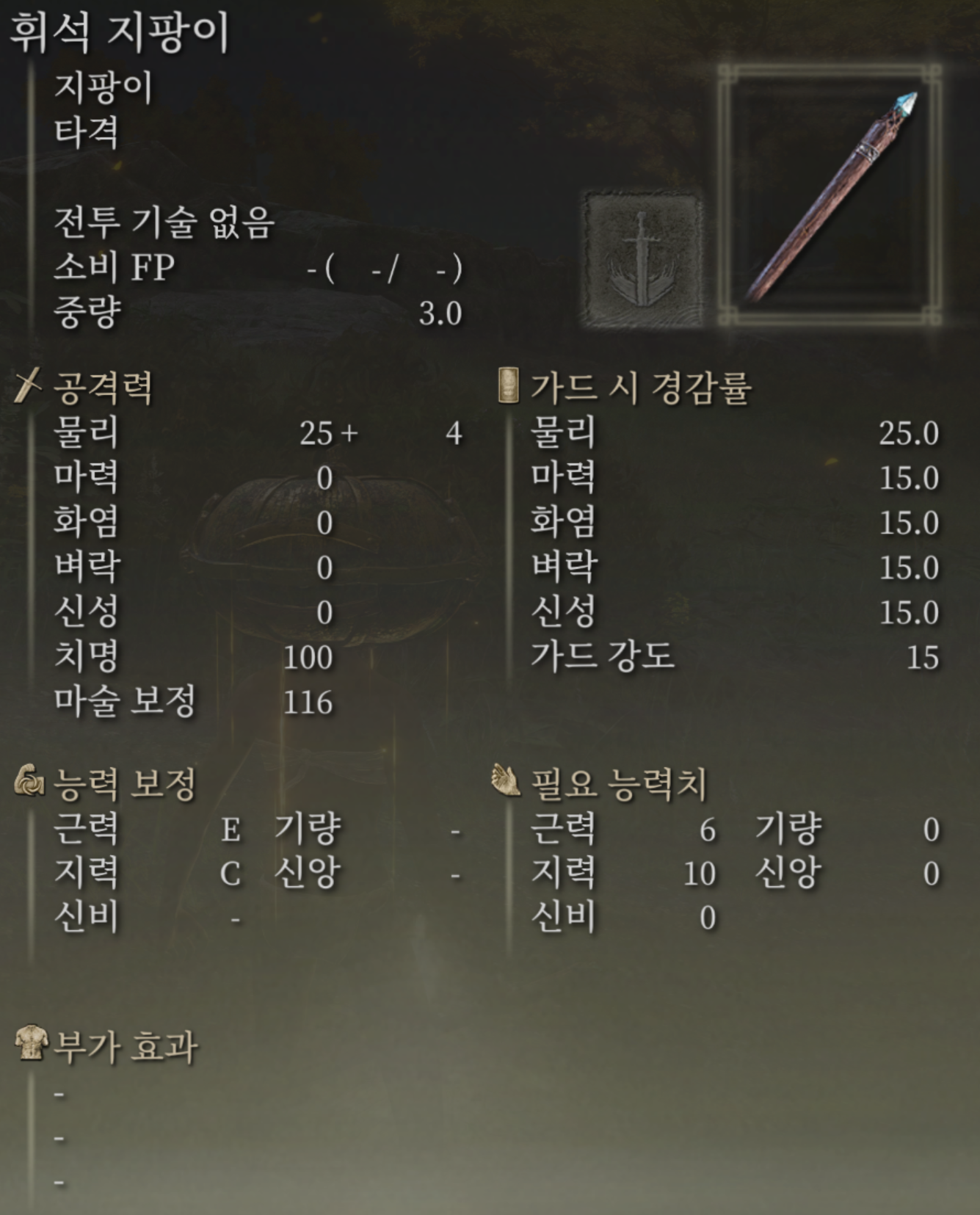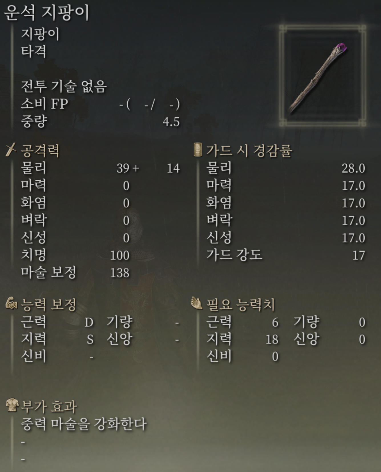 죄수 출신의 기본무기이며 얻기 쉬운 휘석지팡이와 운석지팡이를 비교해봤습니다. 마술보정/능력보정/부가효과까지 운석지팡이가 훨씬 좋네요! 다만 운석 지팡이는 강화가 안됩니다 ㄷㄷ