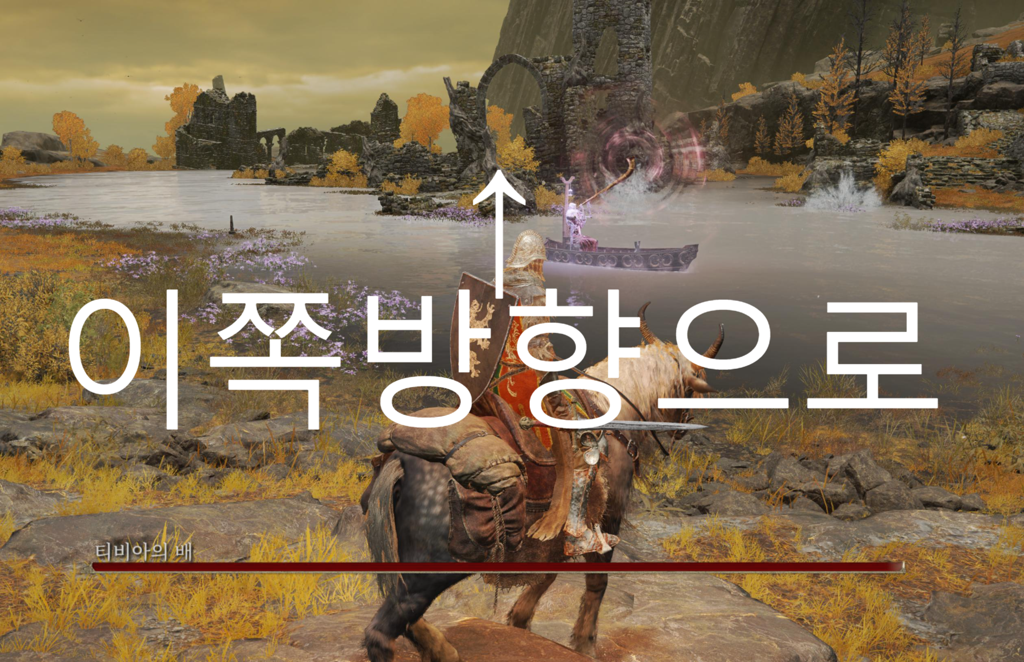 축복에서 왼쪽으로 언덕을 바라보면 석상이 하나 있습니다. 석상으로 가서 석상이 바라보는 방향을 보면 티비아의 배가 있는 호수가 보입니다. 거대한 해골을 소환해서 무지막지하게 공격해오기 때문에 잘 피해서 지나가셔야 합니다.