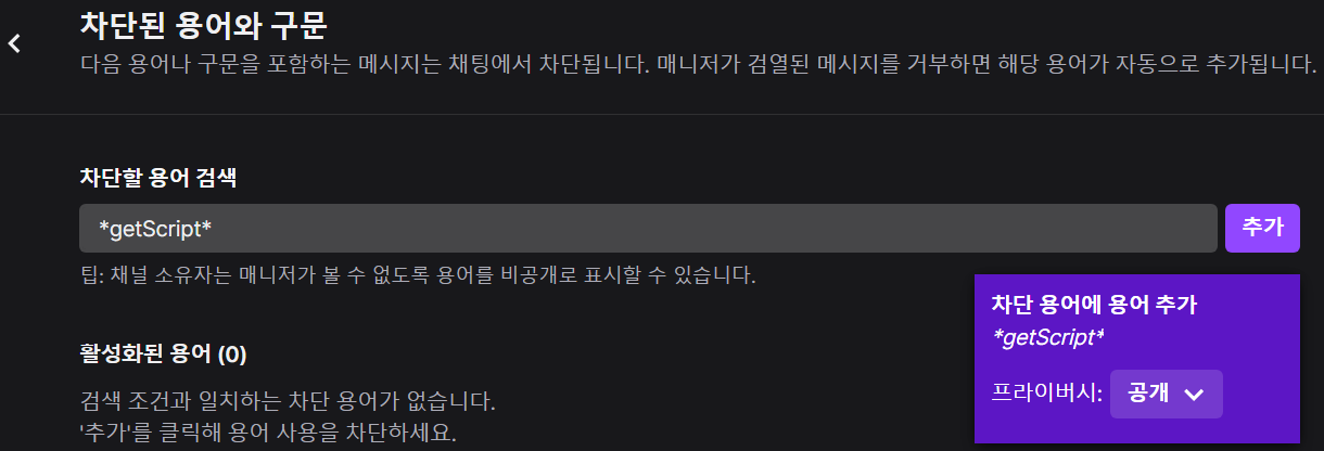 차단된 용어와 구문에 추가합니다. 싹둑이/나이트봇등에 입력하는 경우 우선 채팅창에 테러 메시지가 입력되고 난 뒤에 밴처리 되기 때문에 해당 영상이 재생됩니다;;; 그러니 트위치 자체 차단된 용어와 구문에 추가해서 메시지 자체를 입력못하게 해야합니다.