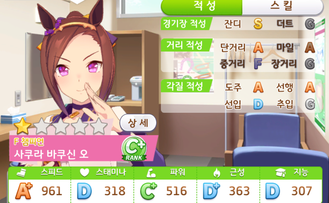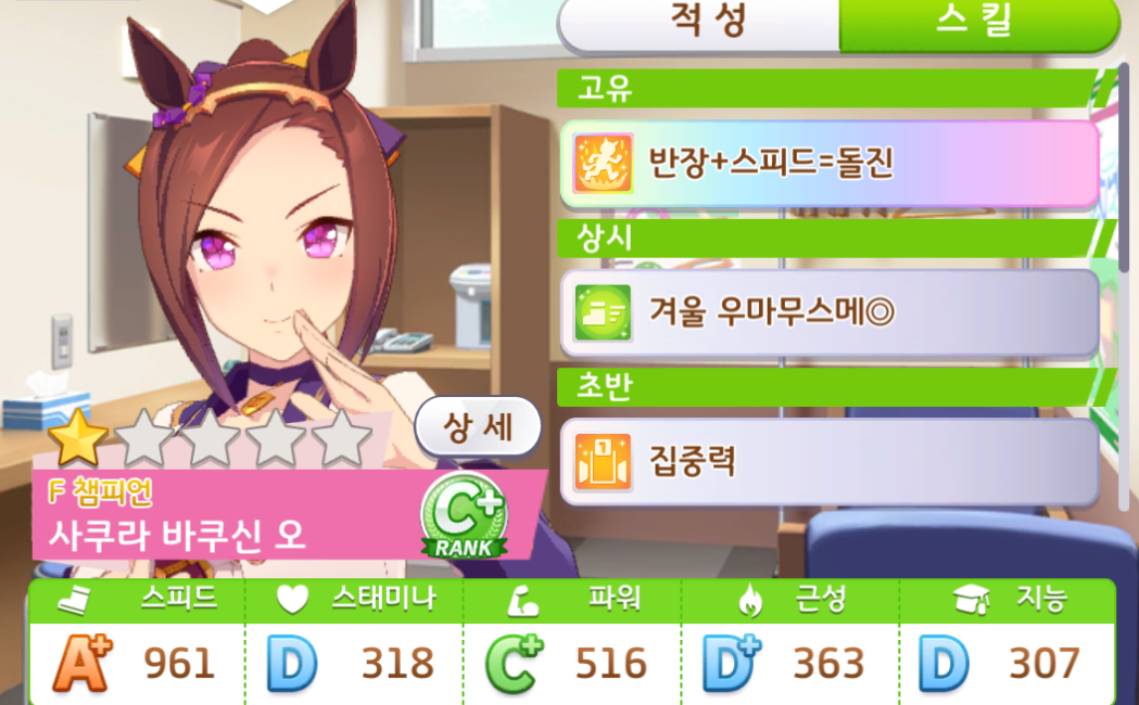 그러다가 사쿠라 바쿠신 오 도주마로 설정하고 적당히 휴식해주면서 냅다 스피드만 올렸는데...