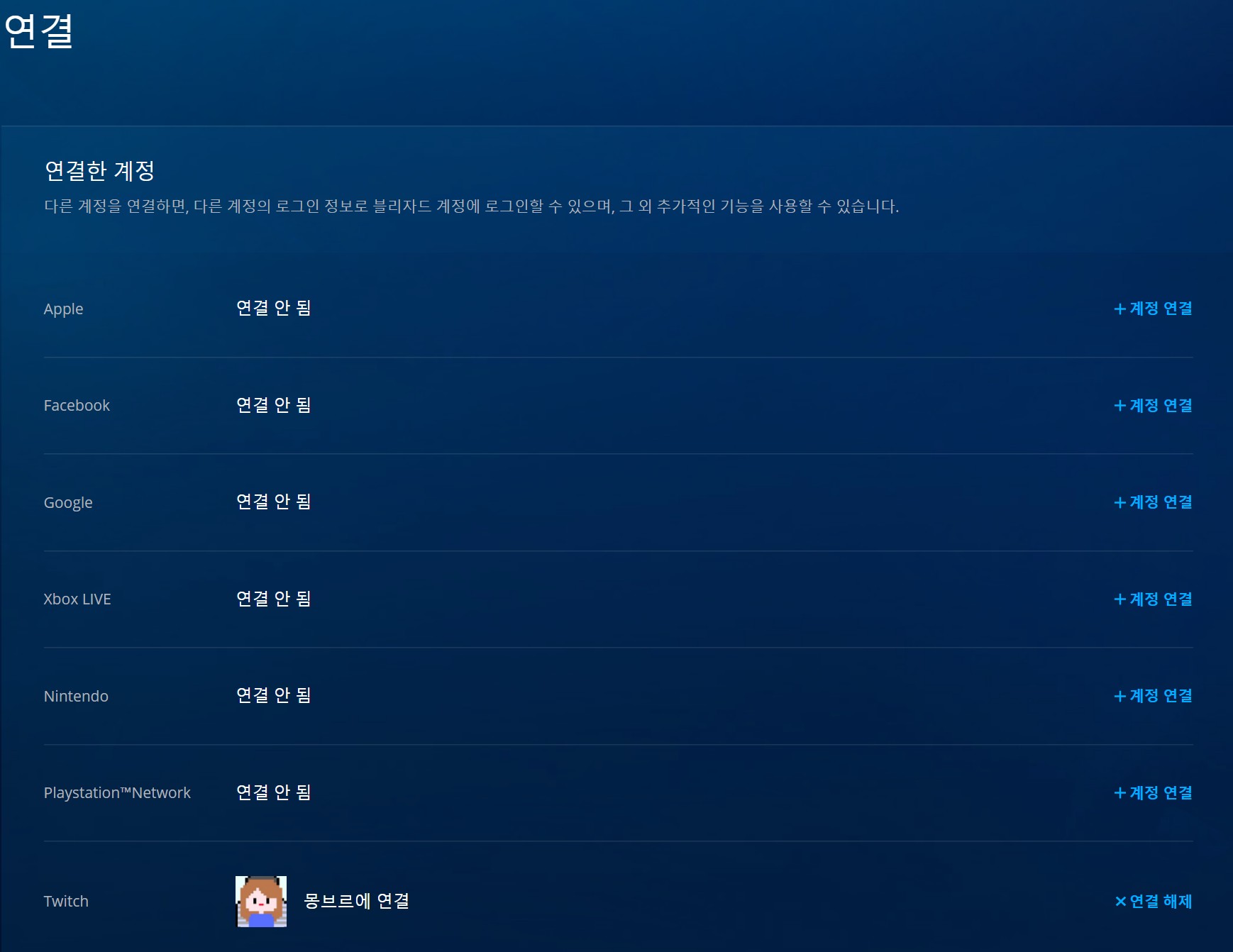 트위치에서도 블리자드에서도 계정이 연결되어 있는 것을 확인 할 수 있습니다.