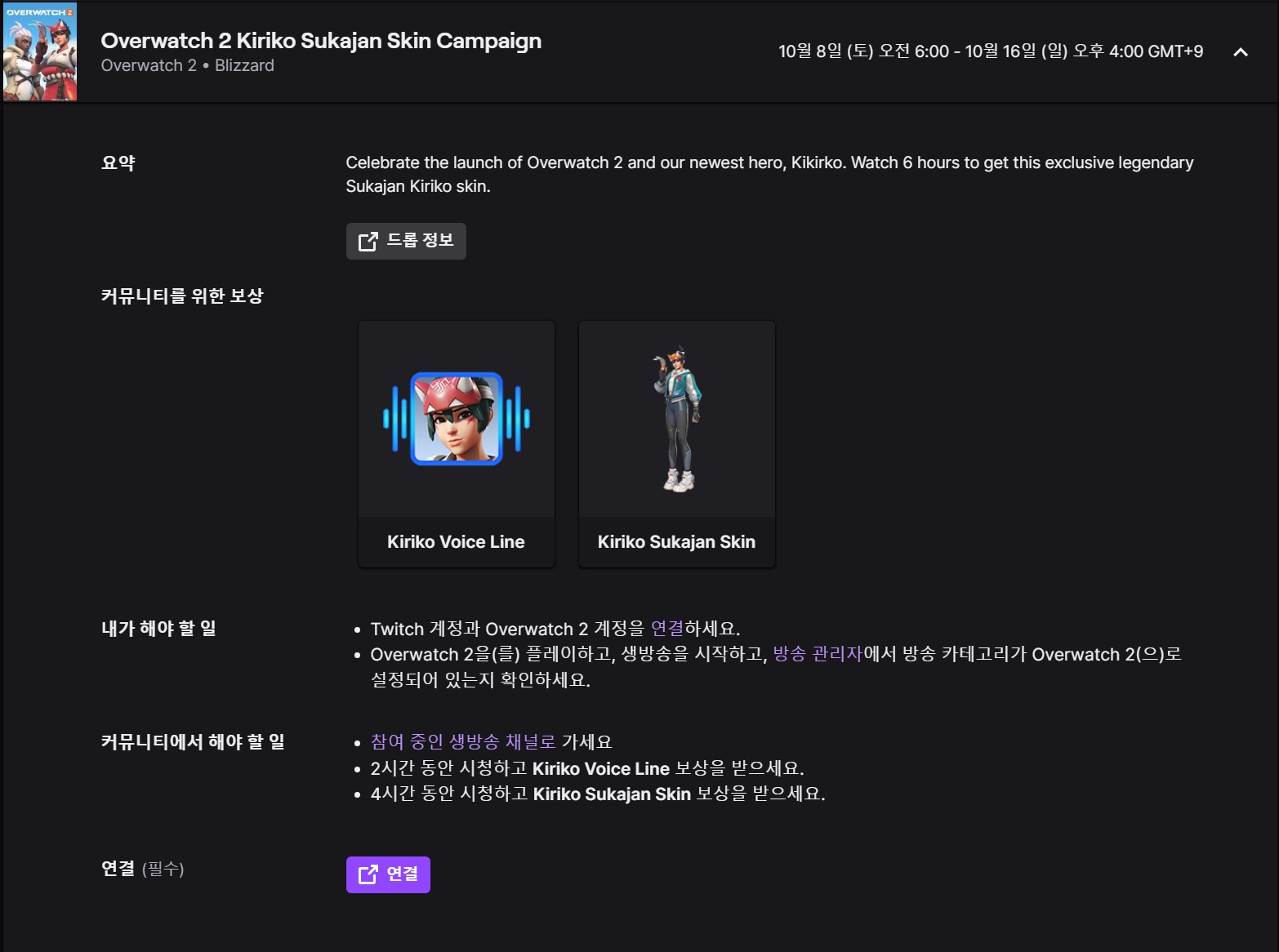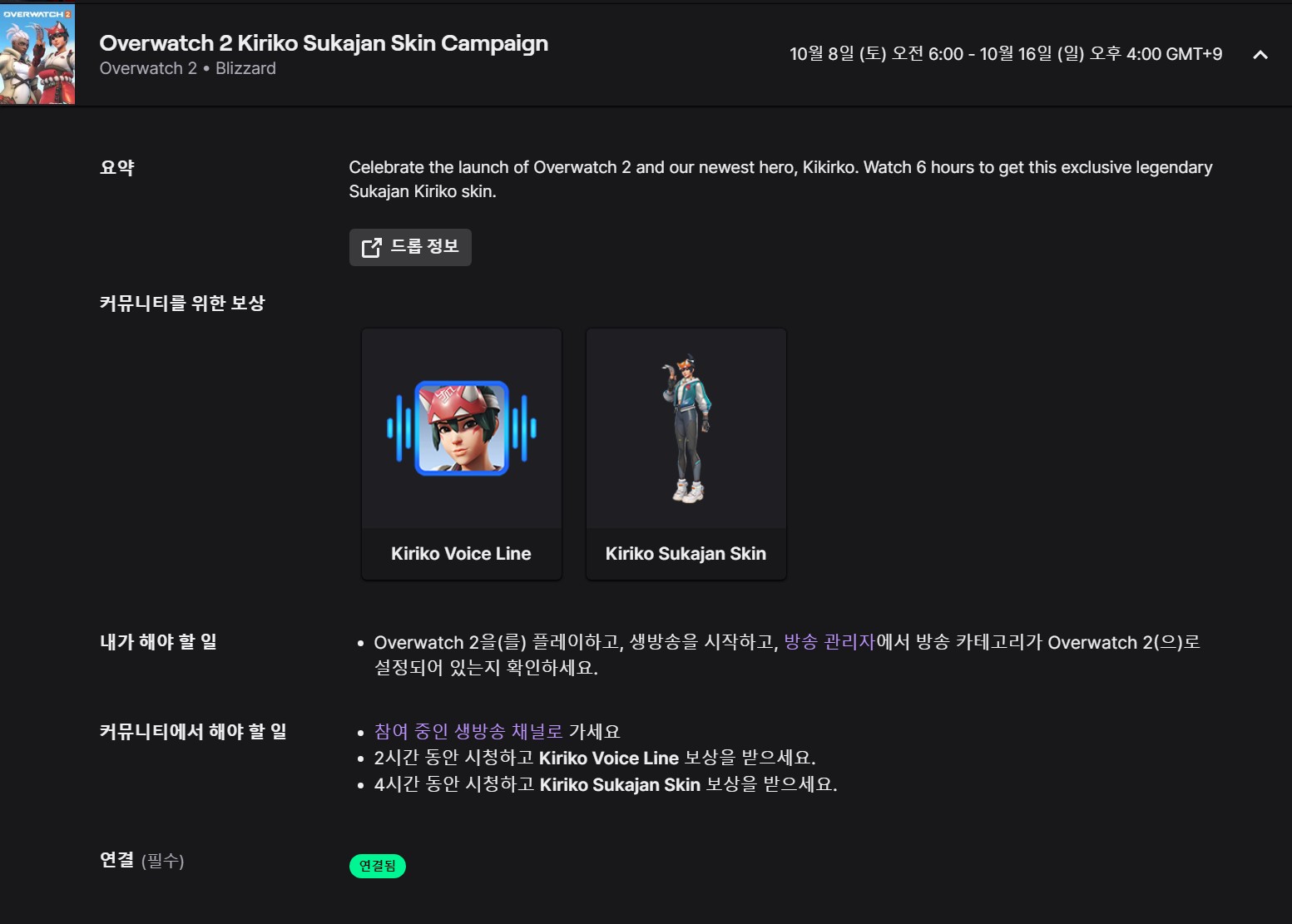 오버워치2가 나오면서 드롭스 진행관련해서 정리가 좀 필요한거 같아서 정리해봅니다. 드롭스란 트위치에서 시청자가 특정 카테고리를 일정 시간 이상 시청할 시에 보상을 획득 할 수 있는 시스템입니다. 오버워치2와 관련해서 10월 8일(토) 오전 6시 ~ 10월 16일(일) 오후 4시 까지 드롭스가 활성화 되어있는 채널을 2시간 이상 시청시 Kiriko Voice Line, 4시간 이상 시청시 Kiriko Sukajan Skin을 보상으로 획득 할 수 있습니다.