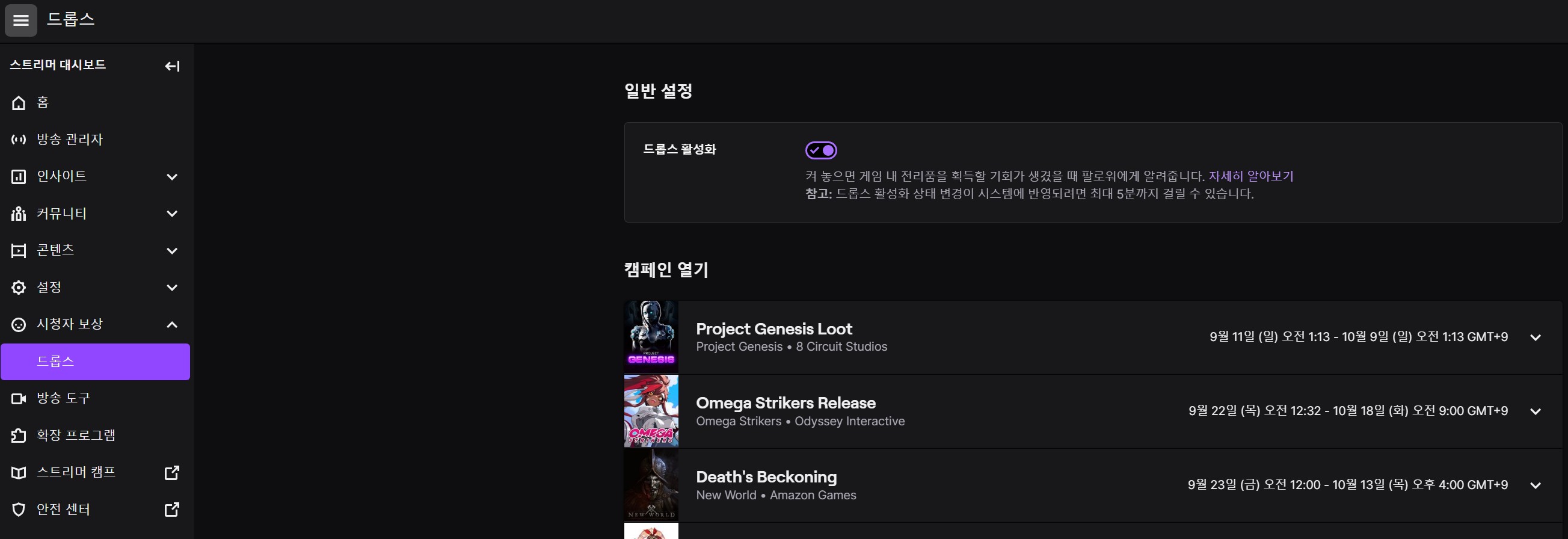 스트리머 대시보드 -> 시청자 보상 -> 드롭스 -> 드롭스 활성화 on