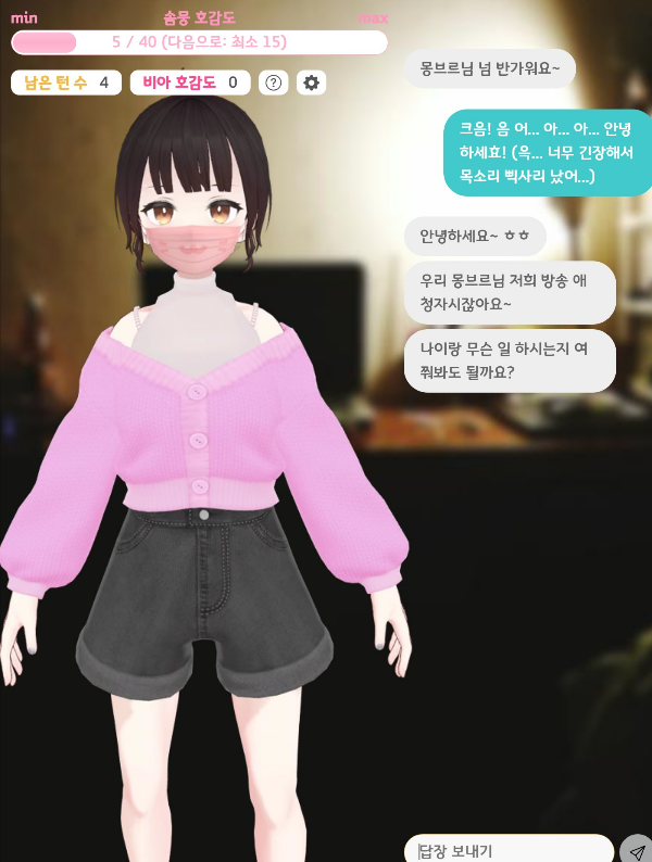 나만의 작은 아이돌 시즌2가 출시되었네요. 선택지가 주어지기도 하지만 중간중간 선택지를 주는 것이 아니라 문자나 디엠을 보내는 형태로 진행하게 되는 게임입니다. AI와 대화하는 형태의 심심이 같은걸 생각하시면 편하겠습니다ㅎㅎ 서울대생이 AI로 만든 게임으로 소개가 많이 됐네요ㅋㅋㅋ 설치도 필요 없고 플레이 타임도 15분~30분 정도로 가볍게 즐길 수 있는 게임입니다.