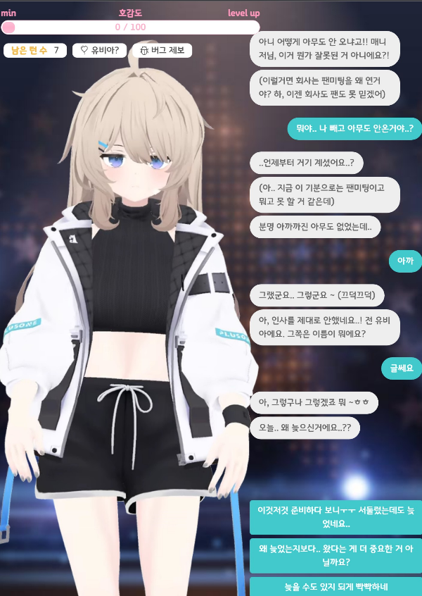 나작아 시즌 1에서는 아이돌 연습생 유비아가 메인 히로인으로 등장 했습니다. 유비아와 팬미팅에서 만나 호감도를 쌓아 올려가는 형식으로 진행 되었습니다. 초반에 상당히 싹퉁머리 없게 입력하고 선택해도 호감도가 오르락 내리락 하는 모습을 보여서 꽤 흥미로웠습니다 ㅋㅋㅋㅋ