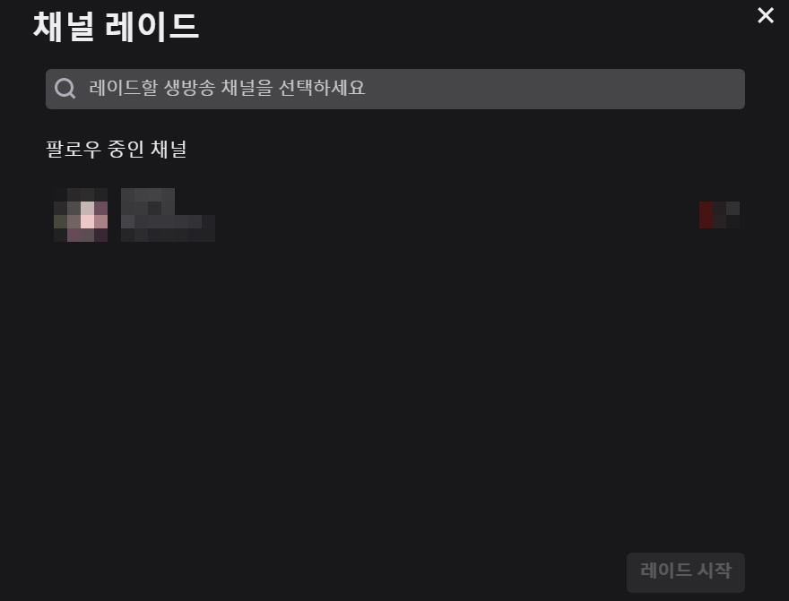채널 레이드 버튼을 누르면 내가 팔로우한 채널 중 생방송 중인 채널이 보여서 선택할 수 있습니다. 또한 검색창에 채널명, 카테고리 등으로 검색해서 레이드 하는 것도 가능합니다.