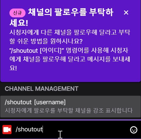 이거 사실 왜 쓰는 건지는 모르겠는데;;; 뭐 알림이 있어서 한번 써봤습니다. 스트리머가 채팅창에 해당 명령어를 입력하면 팔로우해달라는 공고 메시지를 띄울 수 있네요.