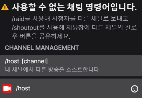 기존에는 호스팅과 레이드 차이를 물어보면 그거 설명하느라 좀 복잡스러웠는데 호스팅 기능이 사라지고 이제 레이드만 남았네요;;; /host 명령어를 입력하면 [사용할 수 없는 채팅 명령어입니다.]라는 문구가 보이고 레이드를 통해 다른 채널로 보내라고 하네요.