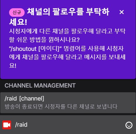 위와 같은 형태로 채팅창에 입력하면 레이드 명령어가 사용 가능합니다. 예를 들어 몽브르(mongbre)에게 레이드를 보낼 생각이라면 뒤쪽 영문 아이디를 입력하시면 됩니다. 영문 아이디는 채널 URL 주소 마지막에 기입되어있습니다.