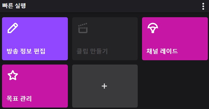 스트리머 대시보드 좌측 메뉴에서 방송 관리자로 들어가면 빠른 실행 메뉴에 채널 레이드 버튼이 있습니다.(혹시 이 버튼이 보이지 않으면 + 버튼을 눌러서 채널 레이드를 추가해주시면 됩니다.)
