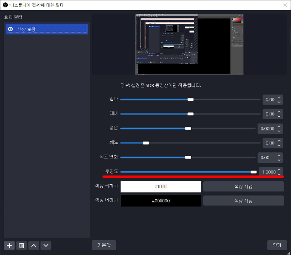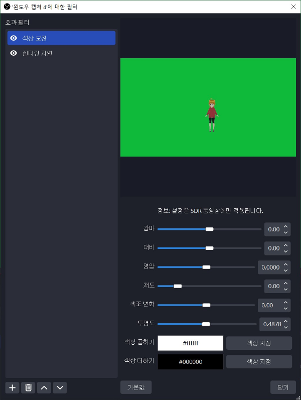 좌측 하단 +버튼 -> 색상 보정을 눌러 필터를 추가하고 색상보정 필터에 보시면 투명도를 조절하는 바가 있습니다. 좌측으로 갈수록 투명해지고. 우측으로 갈수록 진해집니다. 렌더링 지연에 보시면 지연시간을 입력하는 칸이 있습니다. 숫자 값이 클수록 더 나중에 반응하게 됩니다.