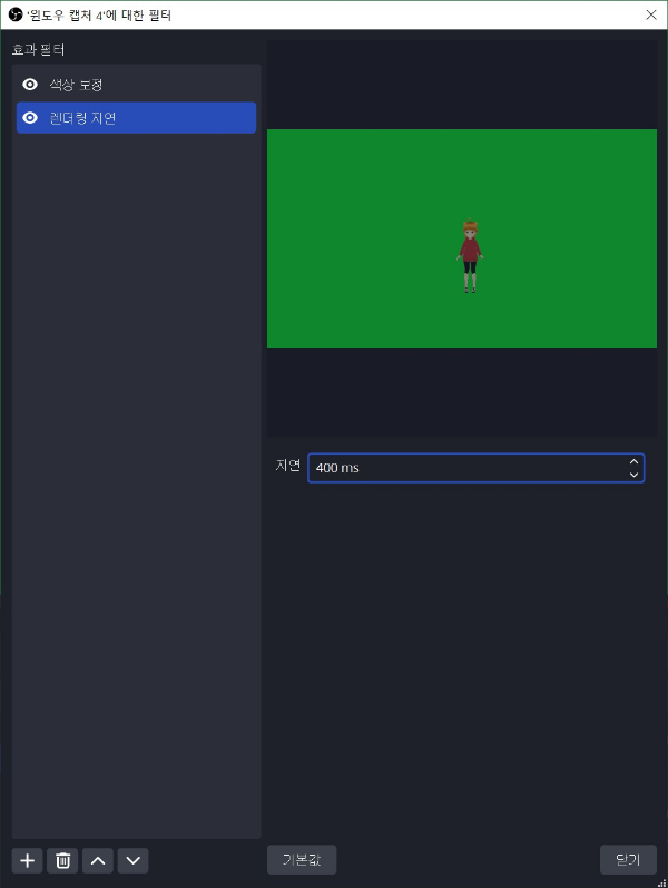 소스를 추가하는 방법은 여러가지가 있겠지만 어쨌든 필터에서 색상 보정(투명도)을 사용하고, 지연시간을 이용하는 것은 동일합니다.