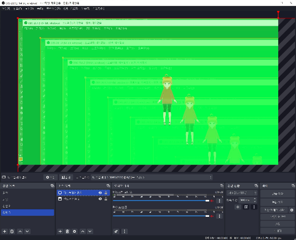 첫 번째로 시도한 것은 OBS 화면을 디스플레이캡쳐 해서 저절로 잔상이 생기게 하는 방법이었습니다. 거울을 양쪽에 두면 양쪽이 서로를 계속 비추는 것하고 비슷한 효과입니다.