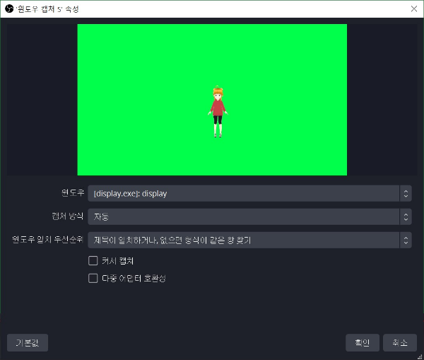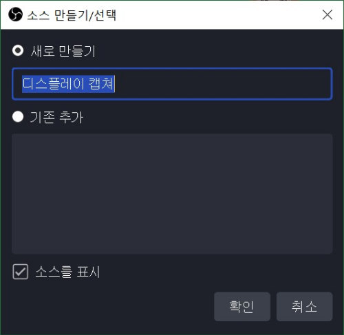 대~충 이름 써주고 디스플레이 캡쳐 속성이 나타나면 OBS가 띄워져 있는 디스플레이를 선택해줍니다.