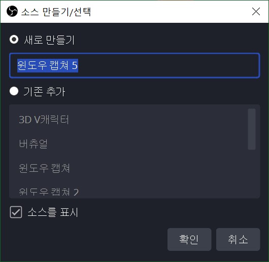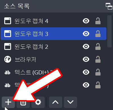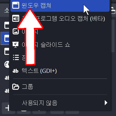 소스 추가 버튼을 누르고 윈도우 캡쳐를 눌러줍니다.