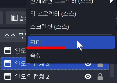 아... 안되는데?! ㅋㅋㅋ 소스 목록 디스플레이 캡쳐에서 우클릭->필터로 들어가 줍니다.