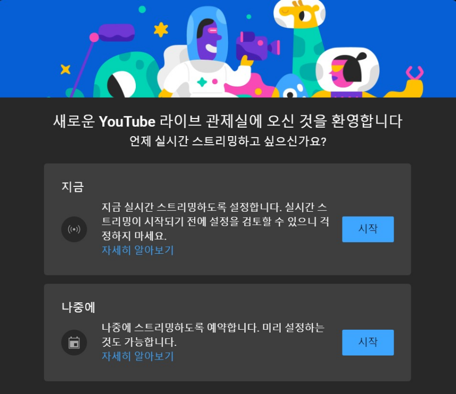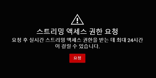 실시간 스트리밍 시작 버튼을 눌렀을때 왼쪽처럼 라이브 관제실이 나온다면 다행이고. 우측처럼 스트리밍 액세스 권한 요청이 뜬다면 요청을 누르고 권한이 주어질때까지 기다려야 합니다. 권한이 받아져있다는 전제하에 진행하겠습니다.