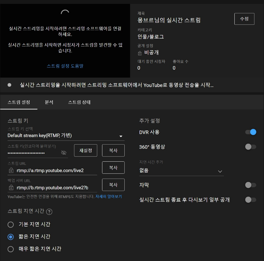 뭐 비공개로 스트리밍할꺼고 어쩌구 저쩌구 여러가지가 있는데요. 우린 여기서 스트림키(인코더에 붙여널기), 스트림URL 2가지만 필요합니다.