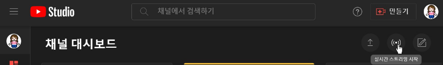 보인 계정의 유튜브 스튜디오에 들어가면 홈화면 우측상단에 실시간 스트리밍 시작 버튼이 있습니다. 이걸 눌렀을때 바로 진행되면 다행이지만 안될수도 있습니다 ㄷㄷㄷ