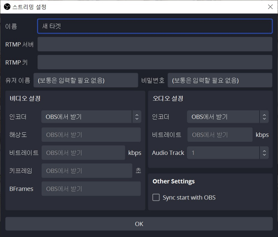 새 타겟 추가 버튼을 누르면 유튜브 송출 정보를 기재하는 창이 나타납니다.