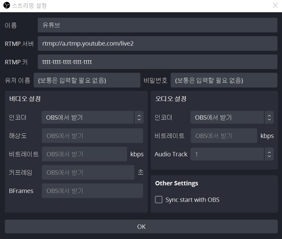 Sync start with OBS : 체크시 방송시작 버튼을 누르면 트위치와 유튜브 동시에 송출시작