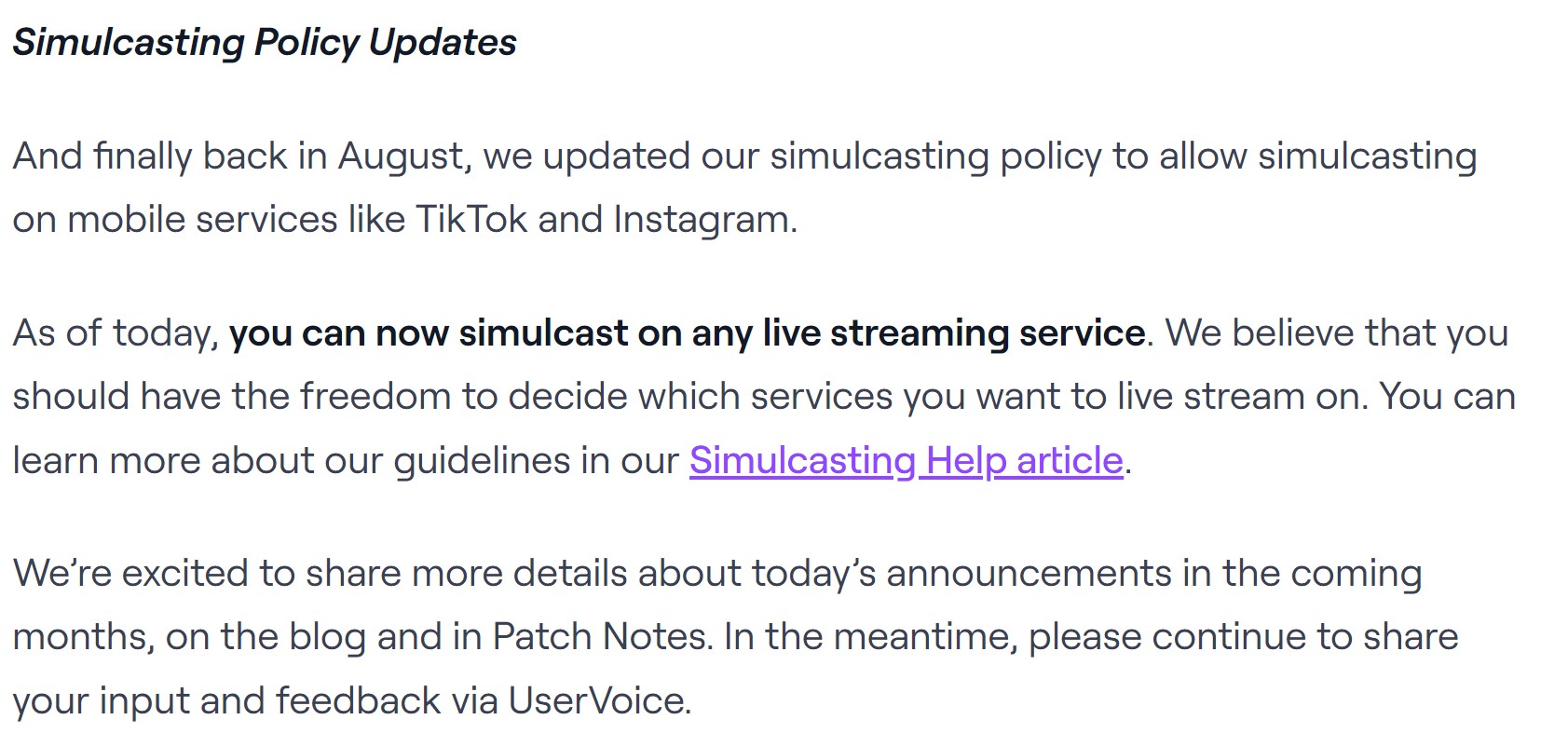 트위치콘 이후로 올라온 트위치 블로그입니다. 여러 내용중 맨아래에 동시송출과 관련된 내용이 기재되어있습니다. 기존에는 틱톡이나 인스타등에서 짧게 동시송출하는것만 허용했는데 이제 전체 플랫폼에 대한 제한을 풀겠다는 내용입니다.