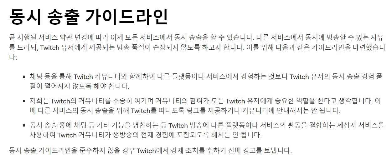 다국어 페이지에 약관 반영하는데 시간이 좀 걸렸던 모양입니다. 동시송출 허가 약관이 반영되었습니다. 다만 동시송출로 인해서 트위치 시청자가 다른 플랫폼의 서비스를 직/간접적으로 체험하게 되는걸 약관으로 막고 있습니다. 동시송출은 허가 하지만 트위치에서 다른 플랫폼으로 이동할만한 경로를 만들지 말아라 정도 같네요.