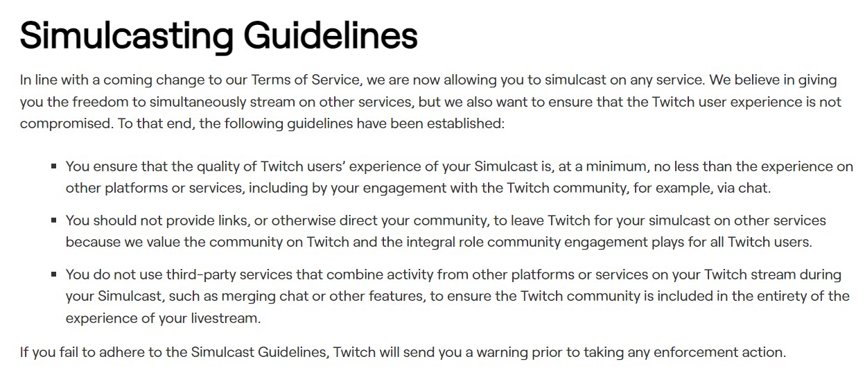 Simulcasting Guidelines We believe engaging in two streams at once can lead to a sub-optimal experience for your community, so simulcasting is prohibited in our Terms of Service. Simulcasting is defined as streaming live on Twitch while simultaneously live