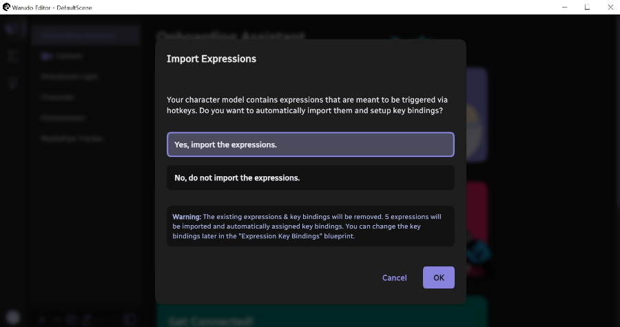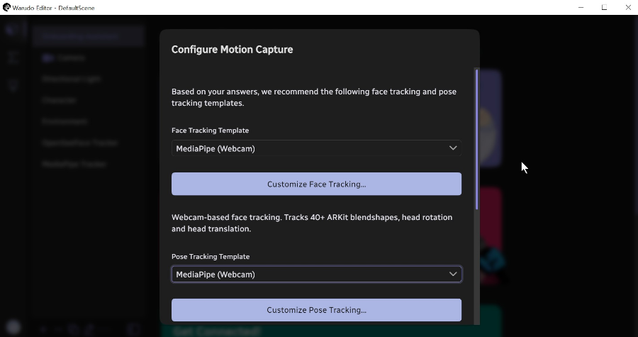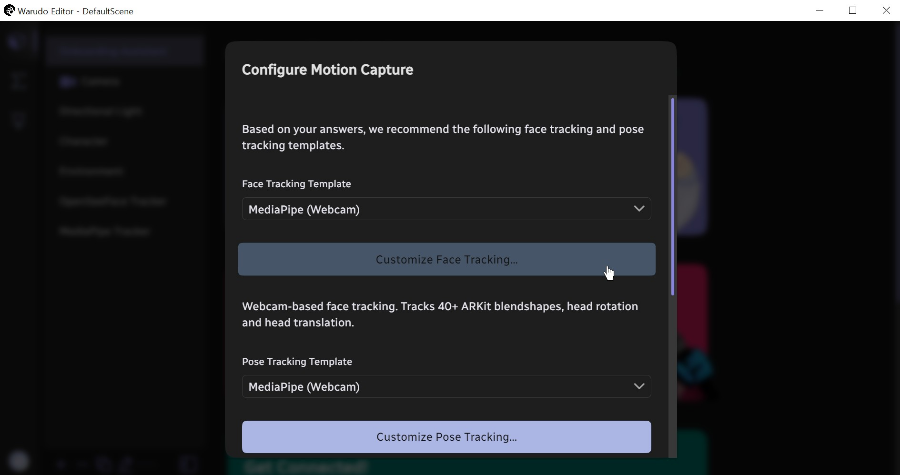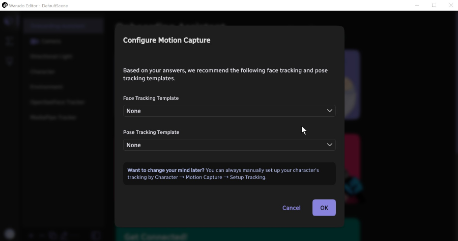 모션캡쳐 관련 설정을 도와주겠다고 물어보네요 yes를 선택하고 OK를 눌러줍니다. 모션캡쳐 관련해서 다양한 옵션들이 나오네요.