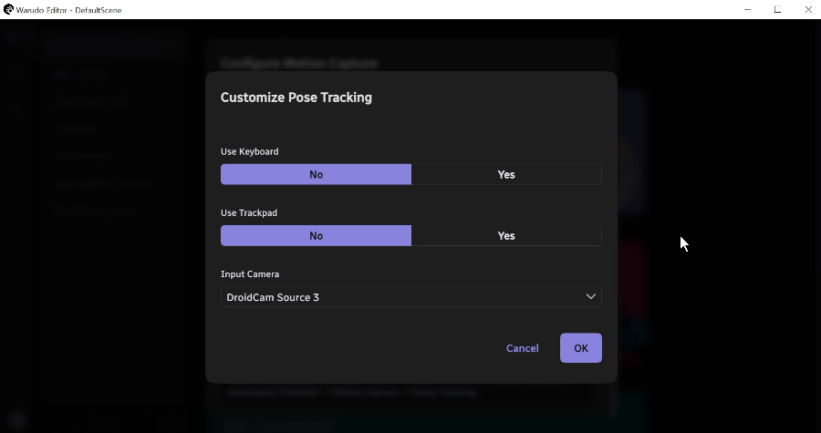 그리고 커스텀에 들어가서 Input Camera의 소스를 선택해 줬습니다. 저는 휴대폰을 웹캠으로 사용해서 진행했기 때문에 드로이드캠소스를 인풋카메라로 선택했습니다. face, pose둘다 인풋카메라 소스를 선택해 줍니다.(동일한 카메라 소스로 지정해도 상관없었습니다.)