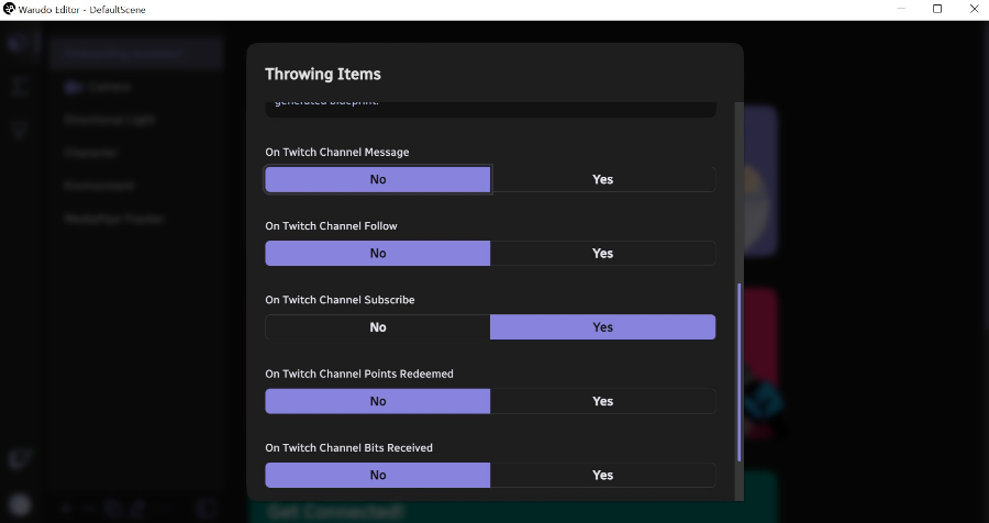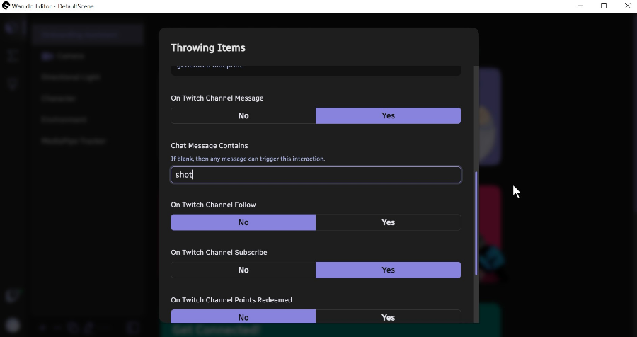 물건을 던지거나, 반짝이 효과를 넣거나, 물을 쏘는 상호작용을 기본으로 제공합니다. 설정도 간단하게 yes/no를 선택하고 키워드만 입력해 주면 간단하게 끝납니다. 저는 채팅창에 특정 키워드를 넣으면 반응하게끔 입력해 봤습니다.