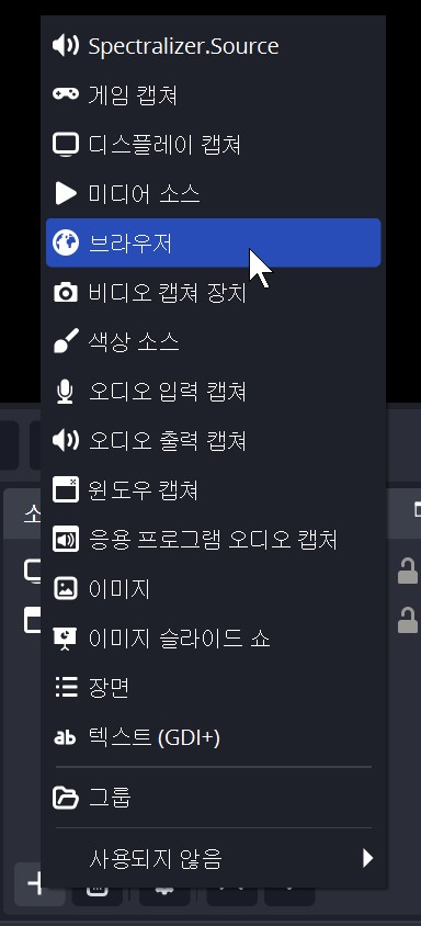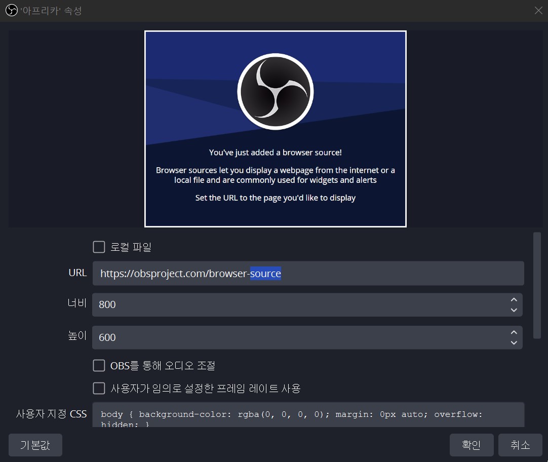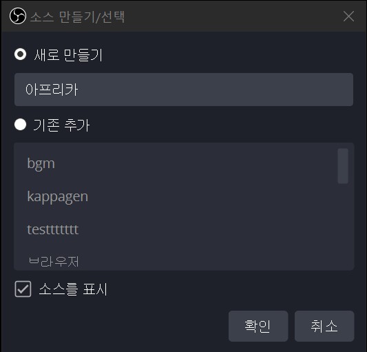 OBS에서 소스추가 -> 브라우저를 선택하고 이름을 정해준디 확인을 눌러줍니다.