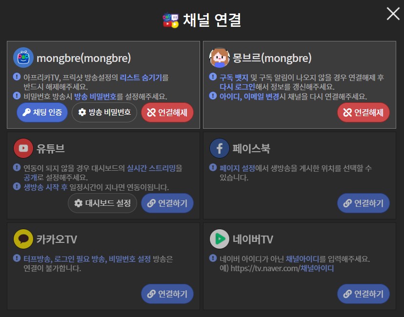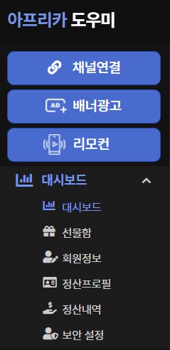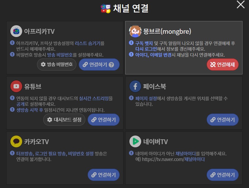 로그인 한후에 제일 좌측상단 채널연결을 눌러주고 아프리카TV의 연결하기 버튼을 눌러줍니다.