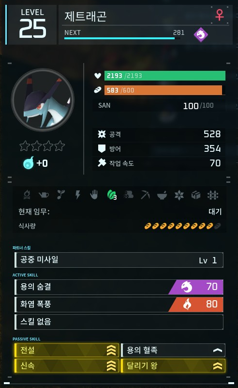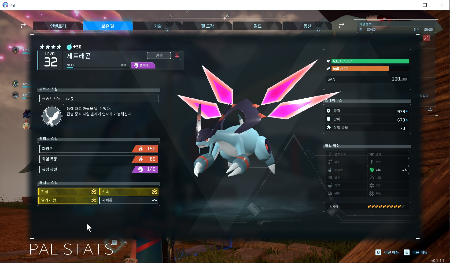 이렇게 해서 현재까지는 펠월드상에서 가장 빠른 날탈이자 이동수단인 전신달재 (전설+신속+달리기왕+재빠름) 패시브를 단 제트래곤이 완성되었습니다~! 확실히 기존 날탈들하고 속도가 비교가 안됩니다. 떨어져있는 아이템 먹으려고하는데 적응 못해서 지나친게 한두번이아니네요 ㄷㄷ