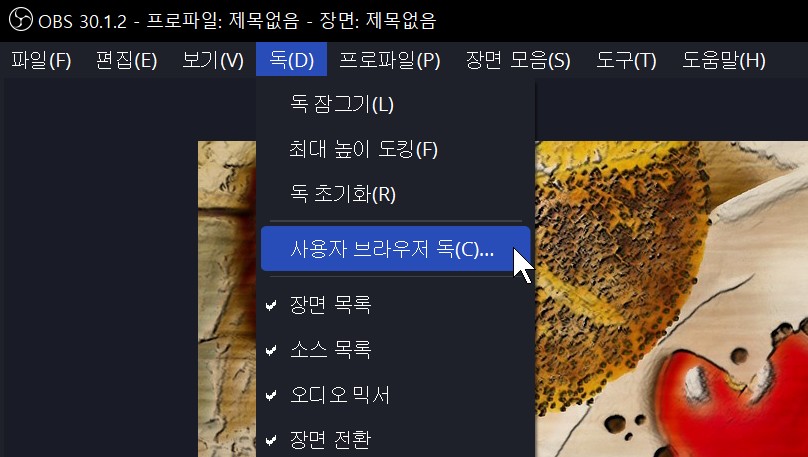 OBS메뉴에서 독->사용자 브라우저 독을 눌러줍니다.