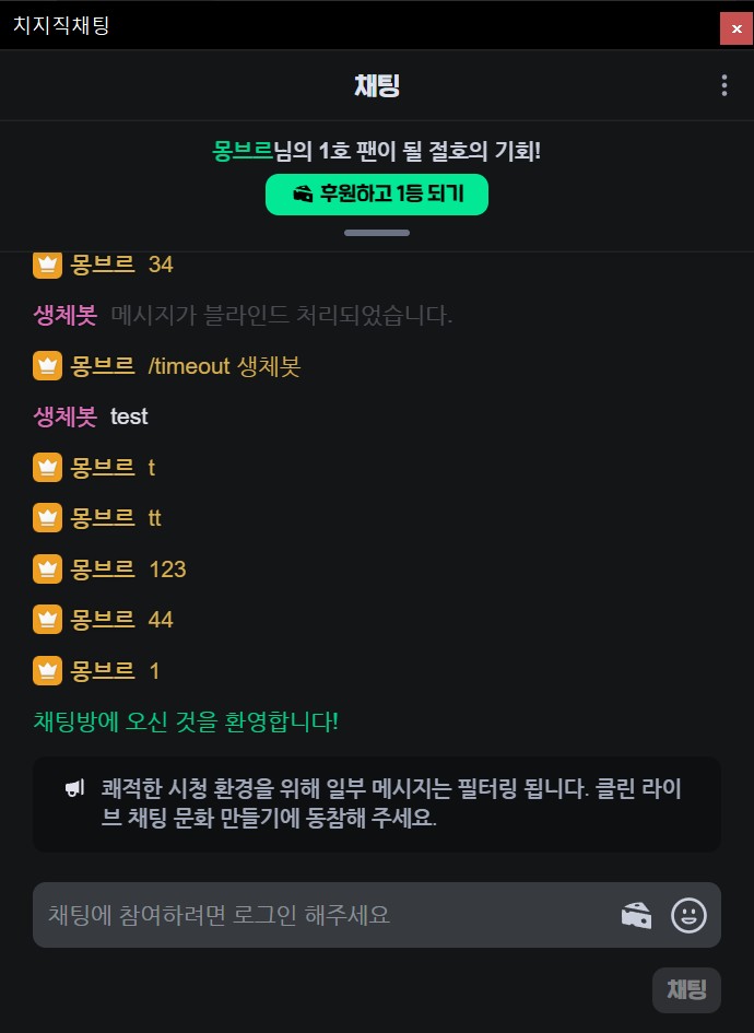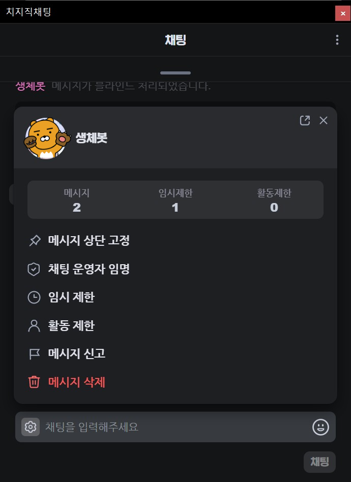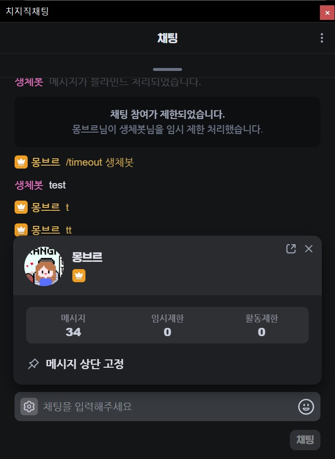 이제 채팅창 독에서 특정아이디를 클릭해 채팅내역을 보거나 임시제한, 활동제한을 하는것까지 가능해졌습니다.
