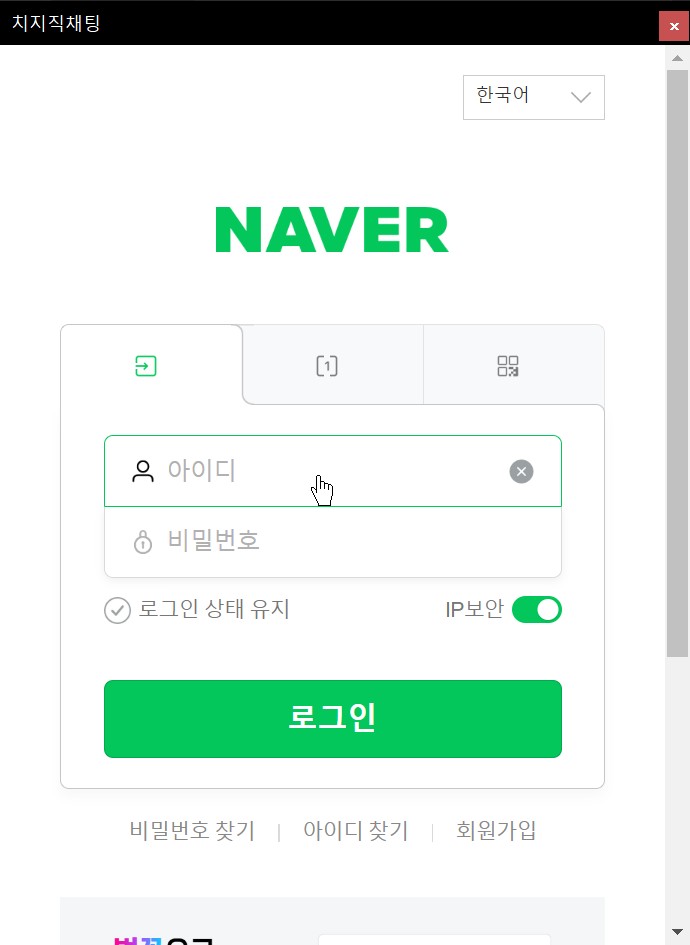 1번까지만 완료해도 보는데 문제가 없지만 로그인이 되어있지 않기 때문에 채팅을 입력하거나 뭔가 행동을 할 수 없습니다. 로그인을 진행해 줍니다.