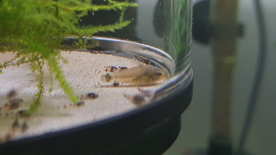 봄이 되었습니다. 알을 따로 수거하지 않았는데 어항에 하스타 치어가 돌아다니기 시작합니다 ㄷㄷ 알밥을 피해서 부화해서 성어들의 입을 피해서 난황까지 소모하고 살짝 성장한 상태네요;; 이때부터 부화통을 매달아 두고 브라인을 준비하기 시작합니다.