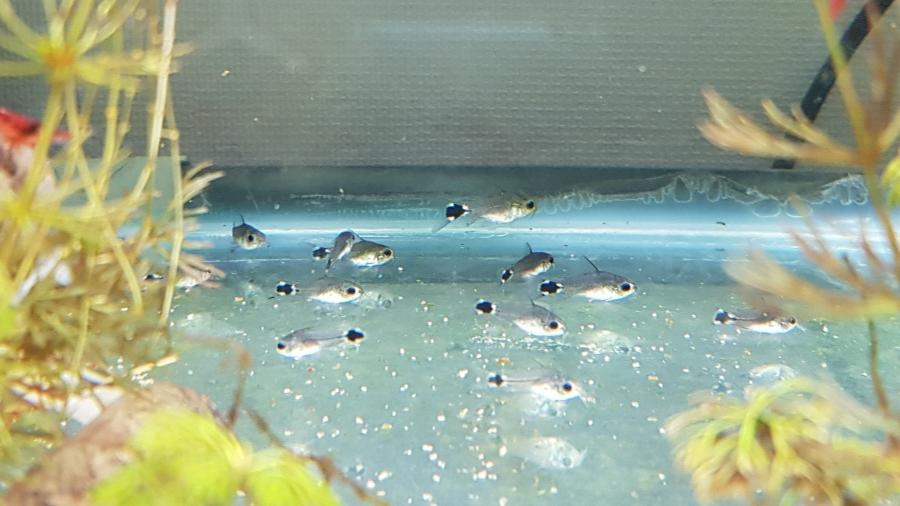 4주를 꽉 채우고 나니 이제 정말 하스타투스 같습니다. 크기가 너무 커져서 움직이면 다른 치어들이 너무 치이기 때문에 조금 이른 감은 있지만 본항으로 보내줍니다. 밝은 조명 바로아래에 있는 부화통에서는 발색이 흐린데 본항으로 들어가니 발색이 제법 진해지면서 크기만 작지 성어랑 똑같이 생겼습니다 ㅋㅋ 4주~6주 정도면 호버링도 하고 군영에 어울리기도 하면서 잘 다녀줍니다.