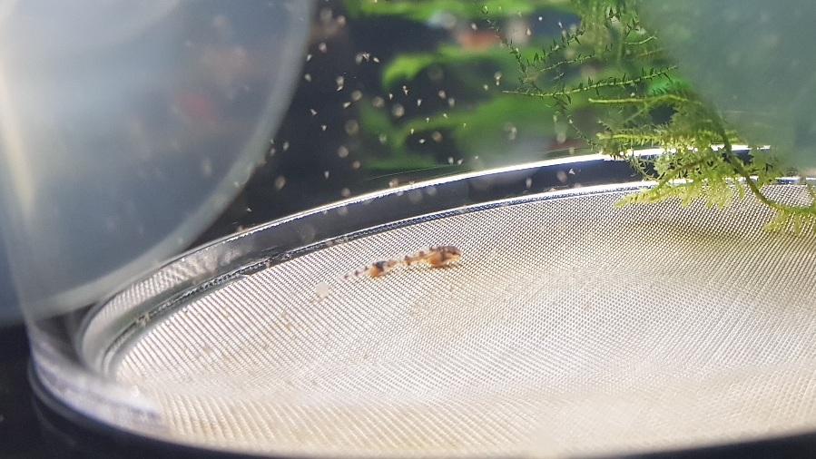 하스타투스는 성어도 약 2.5~3cm 정도밖에 안 되는 소형어 종류이고, 알이나 치어도 굉장히 작은 편입니다. 치어에서 유어를 넘겨 준성어까지 가는 시기의 대부분을 브라인을 급여해야 하기 때문에 관리하는 데 있어서 정성이 조금 필요한 어종입니다. 하지만 뻔질나게 붙여대는 알과 종종 뽈뽈대는 치어를 보면 번식 욕심이 들기 마련이고 알을 수거해서 키워보고 싶은 욕심에 알을 수거해 봅니다.