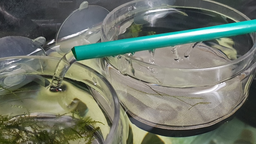 알이나 치어가 조금 굴러다녀도 괜찮으니 부화통 안에 너무 강한 수류가 아니라면 어느 정도 물이 순환되게 수류를 만들어 주는 것이 좋습니다. 사진에 물이 꽤 콸콸 나오는 것처럼 찍혔지만 빨대를 사용해서 만든 레인 바라 생각보다 물이 나오는 양이 많지 않습니다 ㅋㅋ